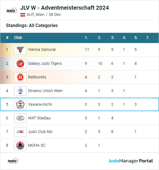 Wir gratulieren allen recht herzlich zu ihren Erfolgen. Jedenfalls waren unsere Betreuer Alex Polt, Maria Haller und Adi Kriegisch voll zufrieden. In der Vereinswertung belegten wird mit dieser Leistung den 5. Gesamtrang, hinter Vienna Samurai, Galaxy Judo Tigers, Ratiborets und Dinamo Union Wien
